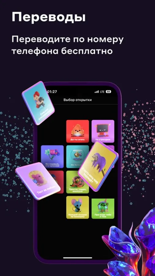 • Денежные переводы с карты на карту – моментально отправляйте деньги по номеру телефона. А также вы можете прикрепить яркую открытку или отправить личное текстовое сообщение получателю.