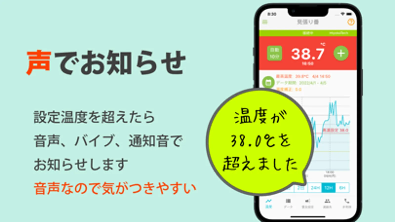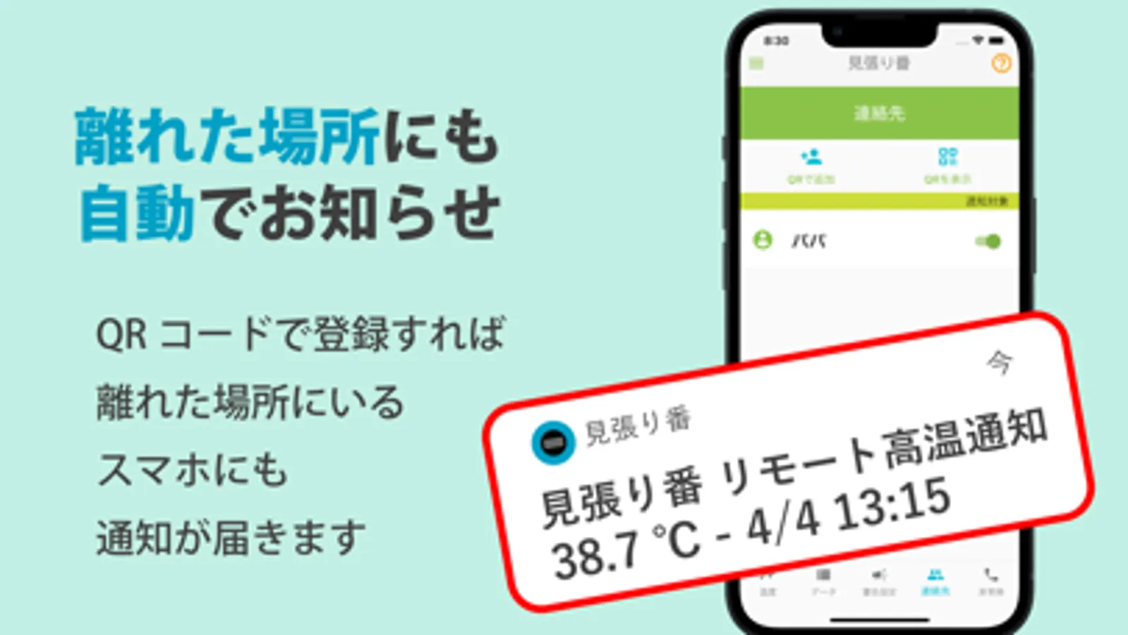 HKTデバイスと連動し、24時間連続で温度の変化を見守ります。高温になると声でお知らせ、離れた場所にある別のスマホにも通知できます。
