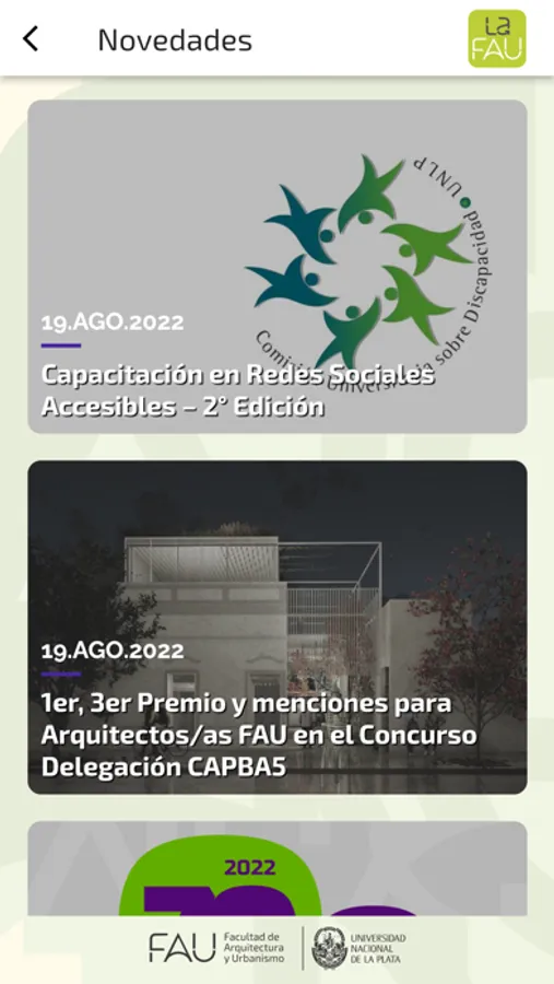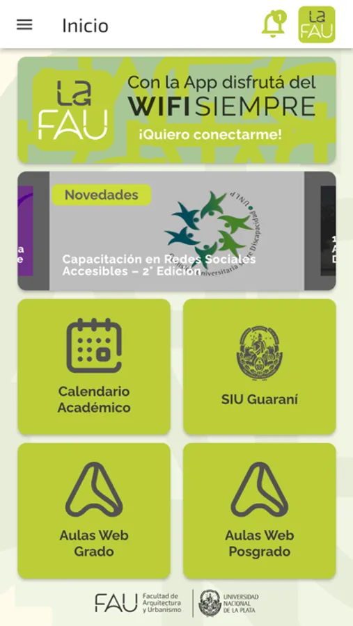 La FAU es la App oficial de la Facultad de Arquitectura y Urbanismo de la UNLP. Está destinada a docentes, nodocentes, estudiantes y visitantes. Creando tu usuario podés acceder al calendario académico, información sobre las materias y el plan de estudios; ingresar al SIU Guaraní, Sistema UNLP y Aulas Web y ver novedades institucionales. Brinda conexión automática a la red de Wi Fi.
