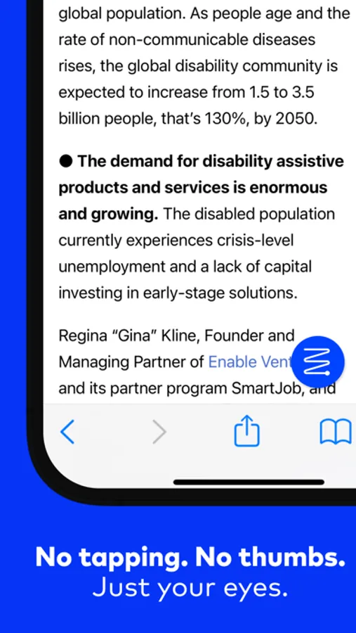 -Safari Extension: When you are viewing text-heavy content in Safari, Athena’s blue icon will be displayed on the screen. Simply tap the Athena icon and the page will be opened in Athena, enabling Eye-controlled scrolling.