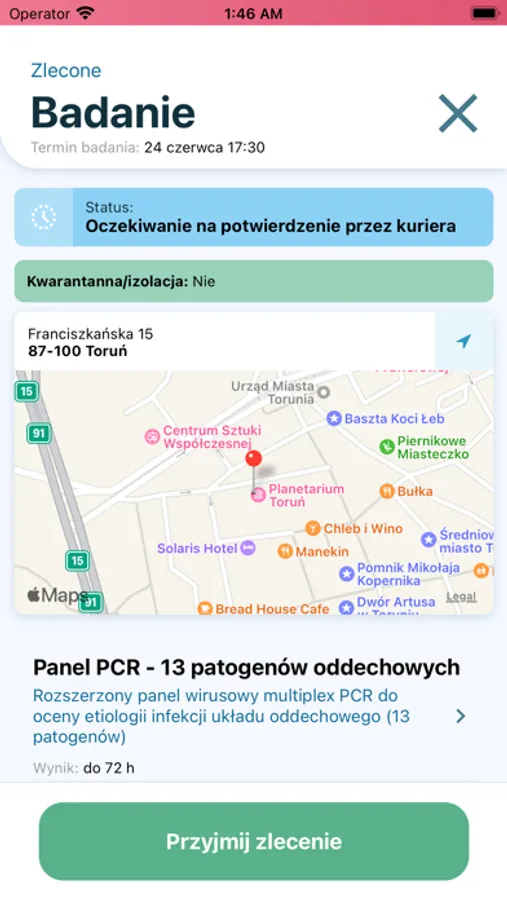 - We wskazanym terminie udajesz się na miejsce pobrania, pobierasz materiał diagnostyczny i dostarczasz go do wskazanego laboratorium.