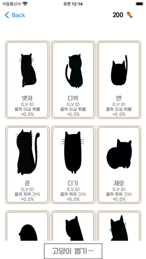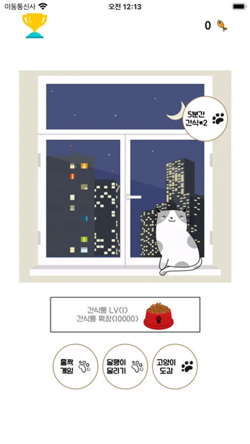 간단한 게임을 통해 고양이 컬렉션을 모아 간식을 버는 게임입니다. 메인화면에선 터치를 통해 간식을 모을 수 있고,