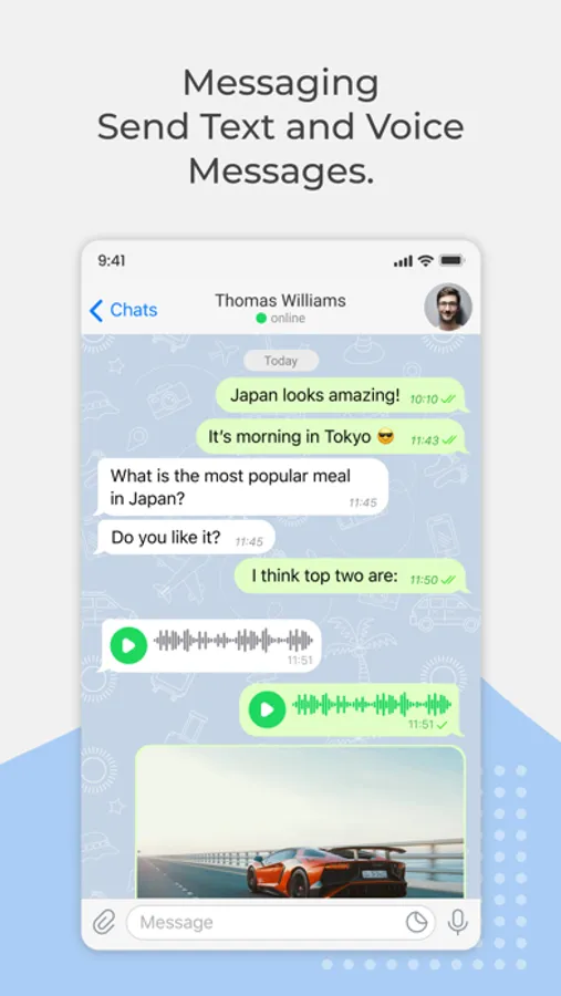 Staying in touch has never been easier. Send free text, photos, stickers, GIFs, video messages, locations, or contacts along with many other types of files.