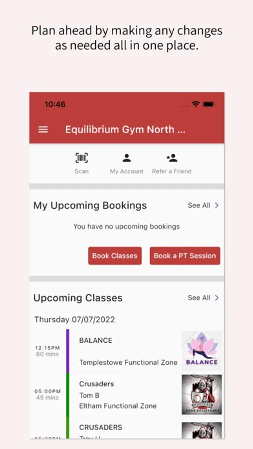 Easily view Equilibrium's full schedule or filter by your gym location to see your gyms timetable in real time. You can see who's running the class, whether the class is full and quickly secure your spot with the push of a button.