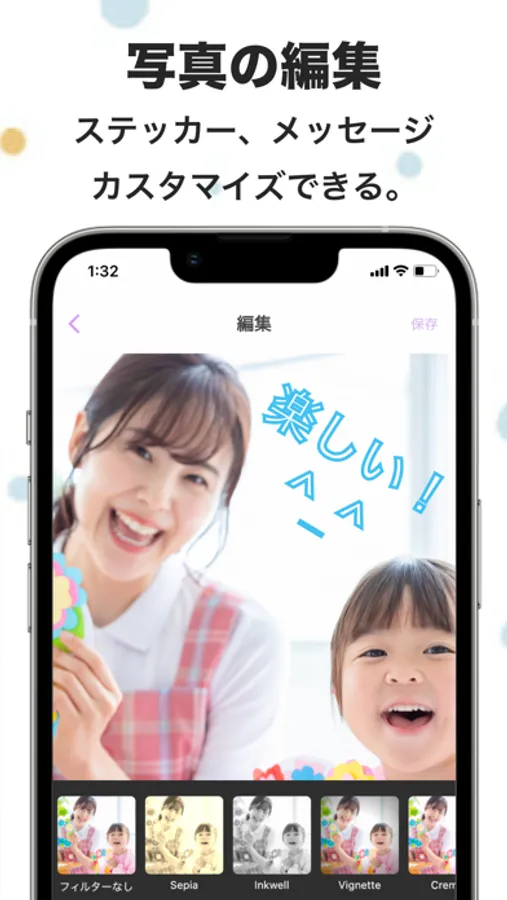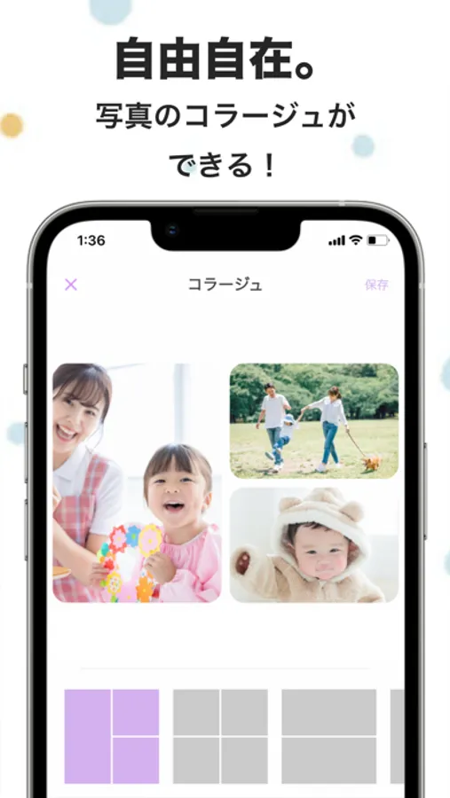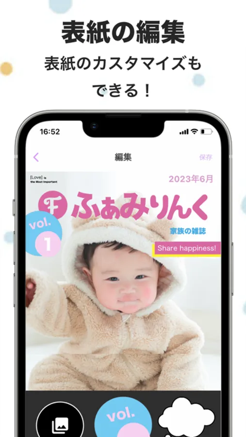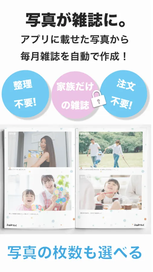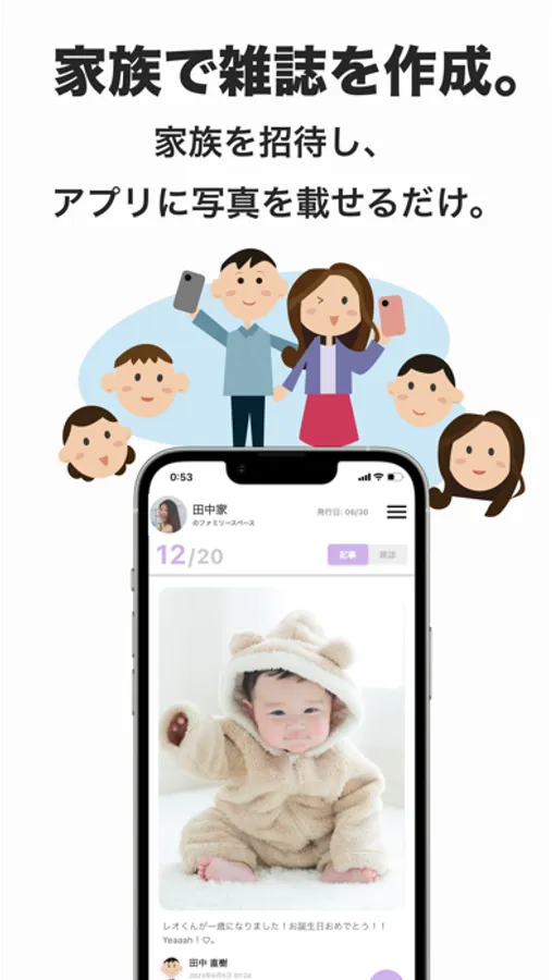 ① You can easily create a family magazine just by uploading photos to the app. Any member invited to the Family Space can post photos and messages to the app.