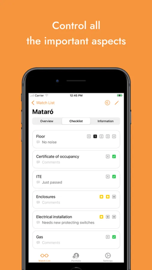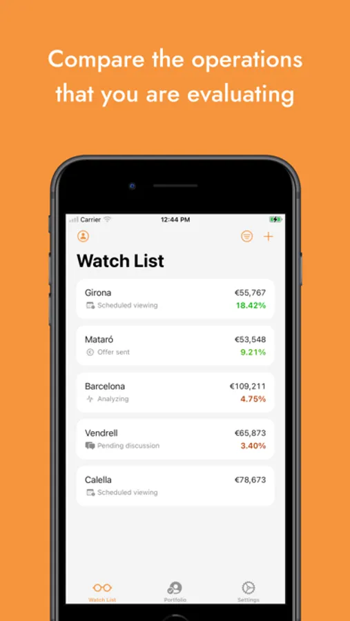 • Filter operations based on their status: Analyzing/Scheduled Viewing/Pending Discussion/Offer Sent/Offer Rejected/Purchased/Discarded