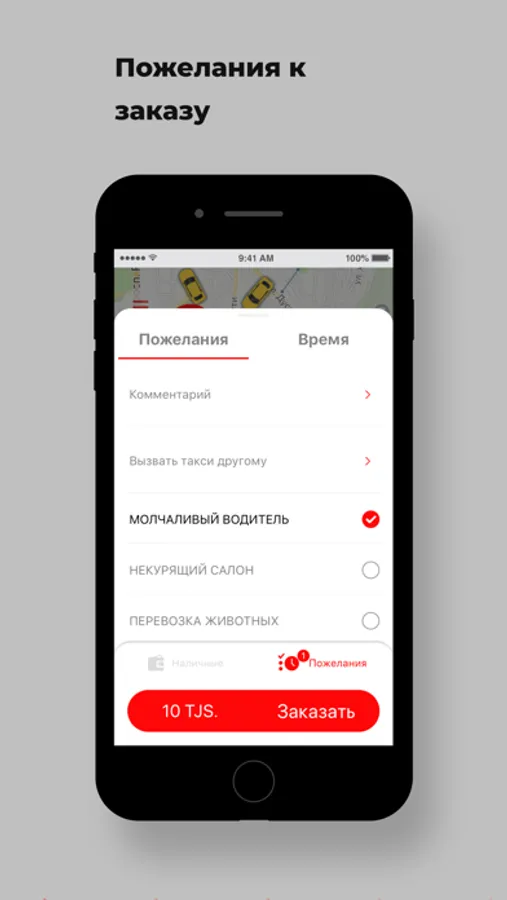 Добавьте к заказу дополнительные пожелания. Например, когда на улице +35 — выберите "кондиционер". Если вы не переносите запах табака — укажите "Некурящий салон", и к вам приедет некурящий водитель.