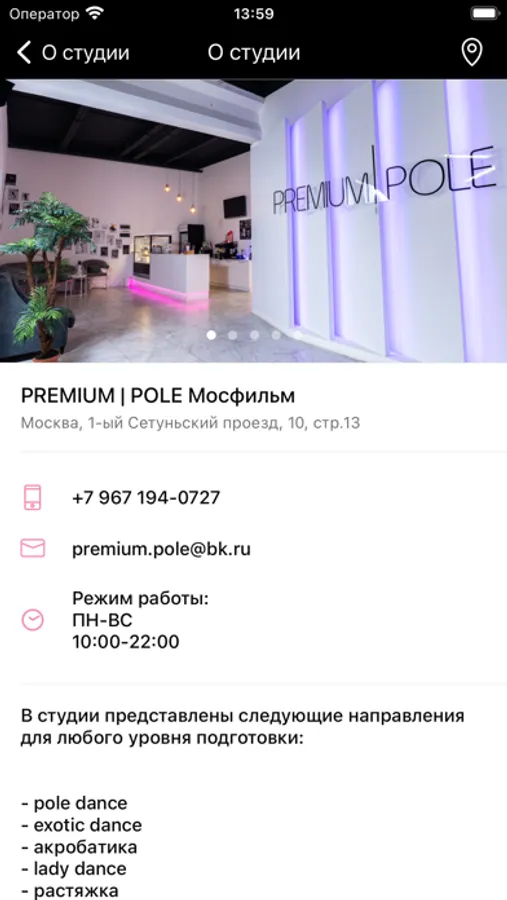 С помощью приложения вы можете записаться на занятие, следить за новостями и мероприятиями студии, расписанием клуба, своевременно узнавать об изменениях и спец. предложениях.