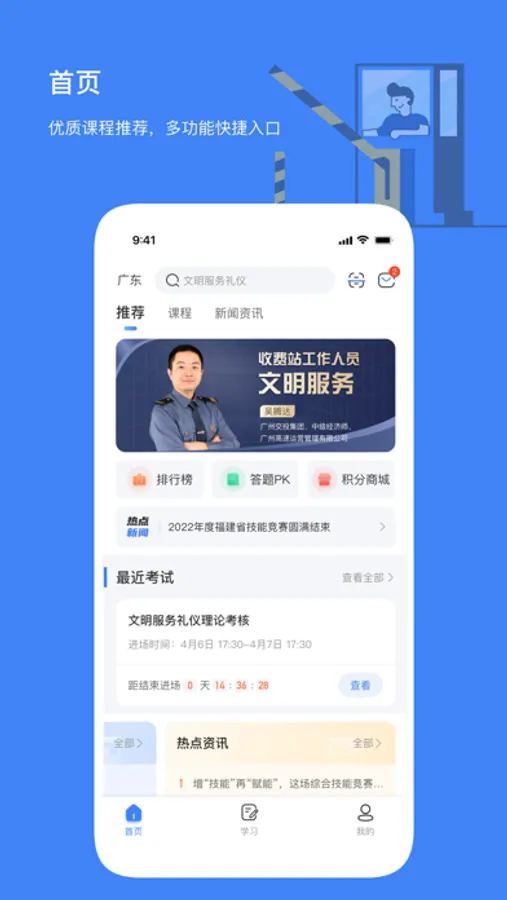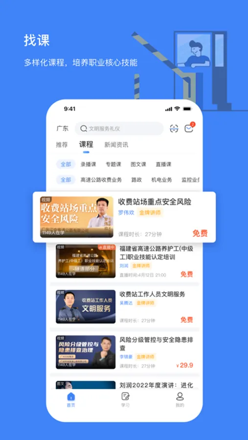 为高速公路营运从业人员、机电人员、路政人员、养护人员等提供专业技能学习,知识交流以及行业资讯的学习、交流平台。立足于实用性的要求,行业人员可通过本平台学习相关行业技能培训课程,可以在练习模块进行理论练习,学圈模块进行学习交流等。本平台聚合了丰富的学习内容,包括直播课、录播课、专题课、图文课、文章等,还可以通过理论练习,车型练习巩固知识。