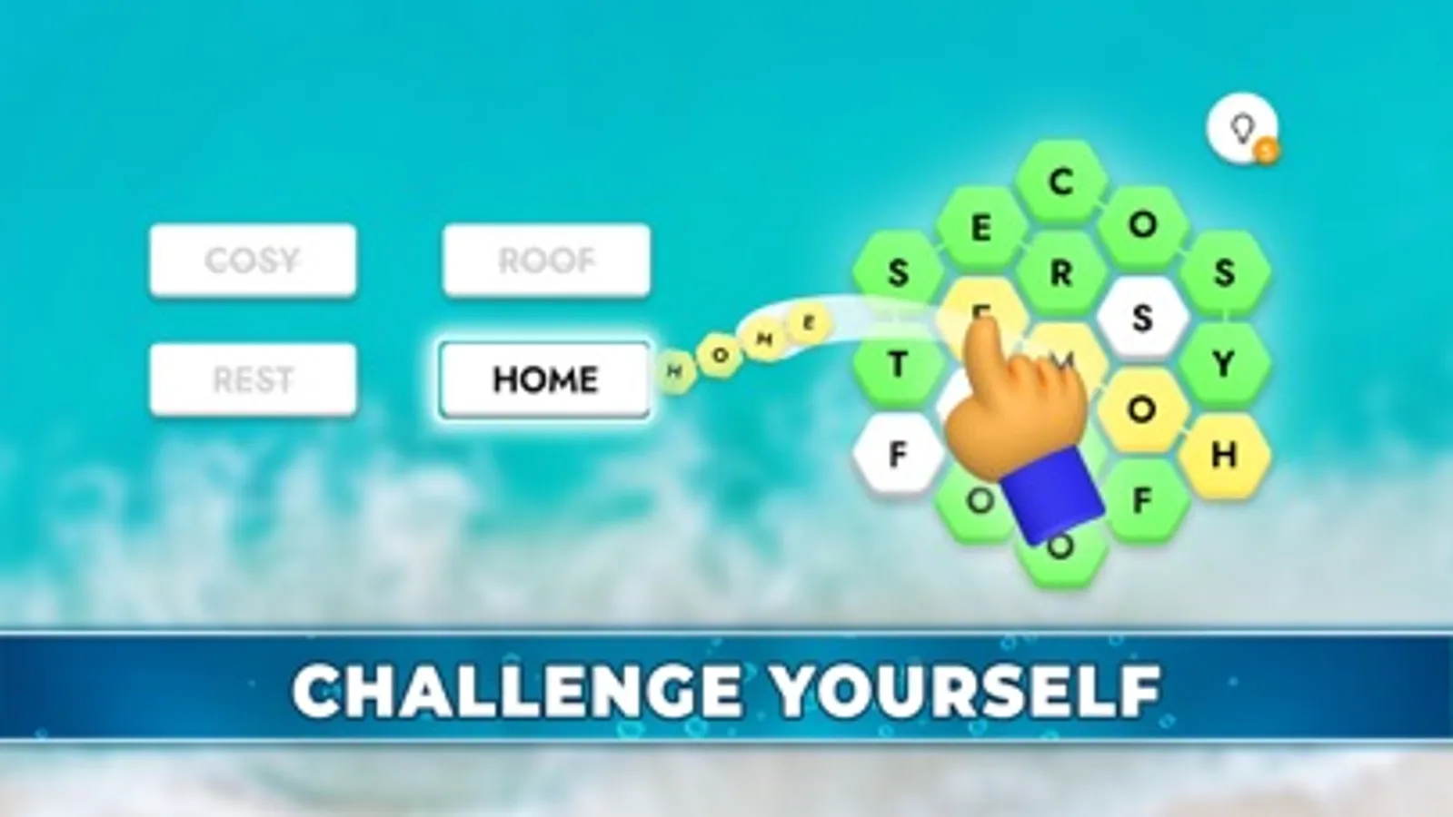 win the stage and advance to the next level by looking at the given words and joining the letters arranged in a hexagon pattern.