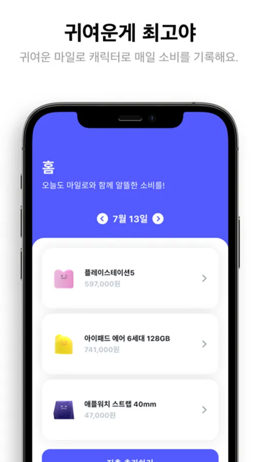 - 내 지출에 대한 만족을 귀여운 마일로 캐릭터로 표시하고, 다이어리를 써보세요!