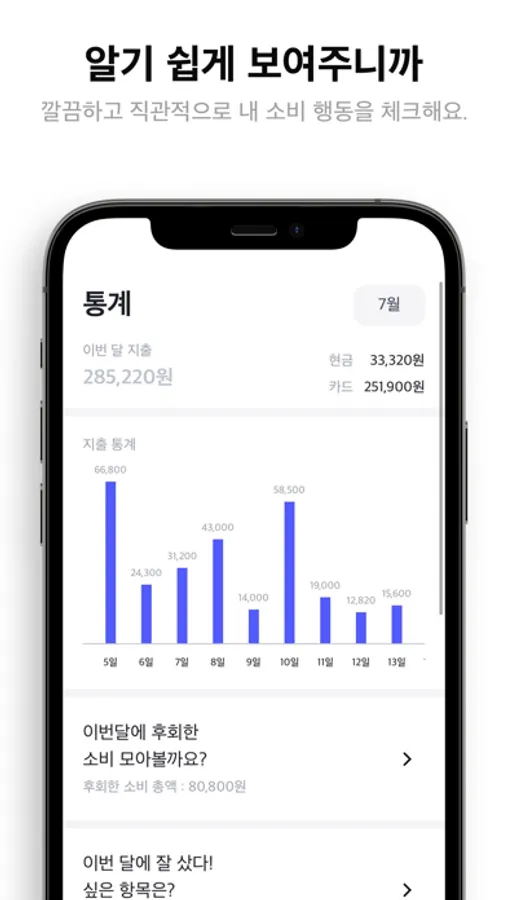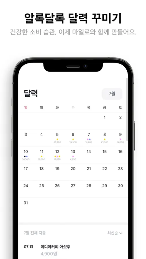 - 매월/매일 지출 통계와 소비 만족 통계를 알 수 있어요. 이제 마일로와 지출 줄이기. 함께 해볼까요?
