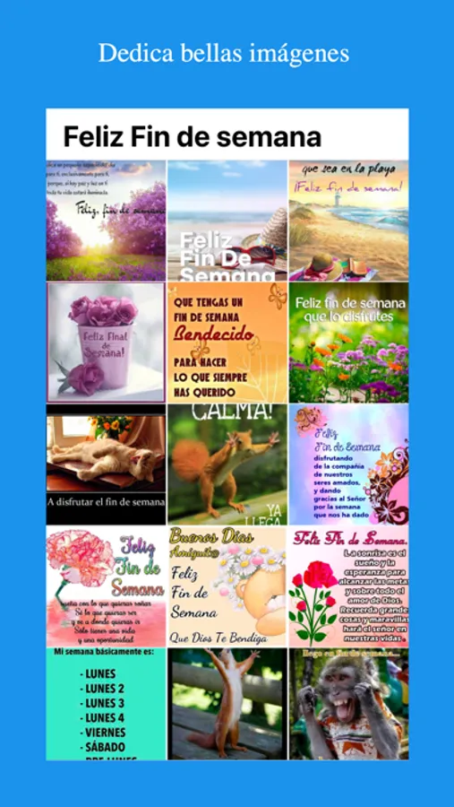 Dedica saludos diarios de los días de la semana a tus amigos, familiares y conocidos. Es una excelente forma de iniciar el dia compartiendo hermosas frases de feliz lunes, martes, miércoles, jueves, viernes, sábado y domingo. Obtendrás imágenes o frases de motivación para saludar y compartir.
