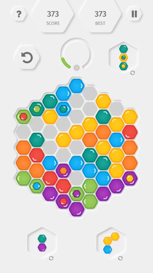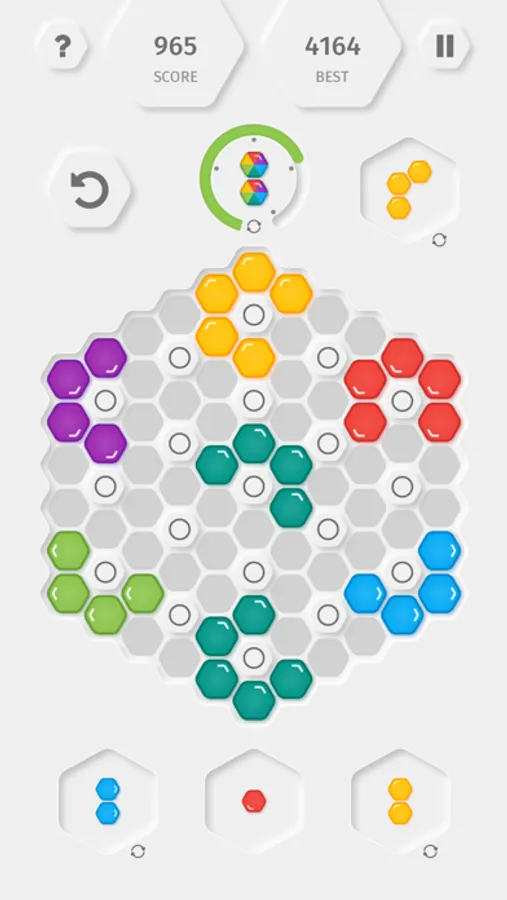Place shapes to the game field. Make rings of the same color. These rings of tiles will be cleared and you get score points. Rotate shapes to find the best position. You can store one shape for later use and you can undo the last move. Clear the rings to get multicolor shapes and the bomb. Place the bomb to center of any ring to clear the tiles around it. The game continues as long as you can place shapes. Try to get as many points as you can.