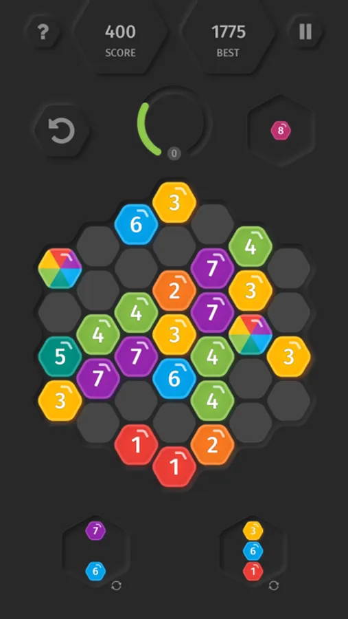 Place shapes to the game field. Make groups of three of more tiles with the same number. These groups of tiles will be merged into the tile with the next number. Maximum tile number is 8. Tiles with number 8 will merge into multicolor tiles. An explosion will occur at the place where the multicolor tiles merge and clear all the tiles around. Rotate shapes to find the best position. You can store one shape for later use and you can undo the last move. Clear the tiles to get bombs. Place the bomb to any occupied cell to clear it. The game continues as long as you can place shapes. Try to get as many points as you can.