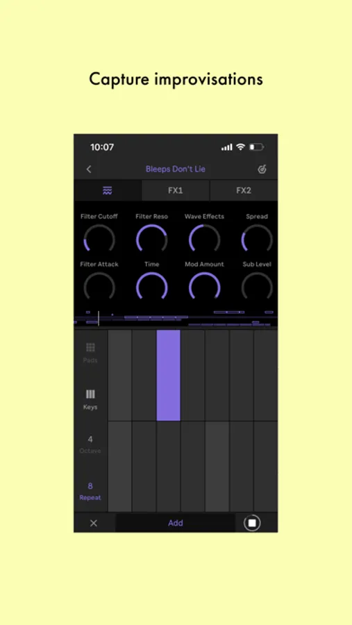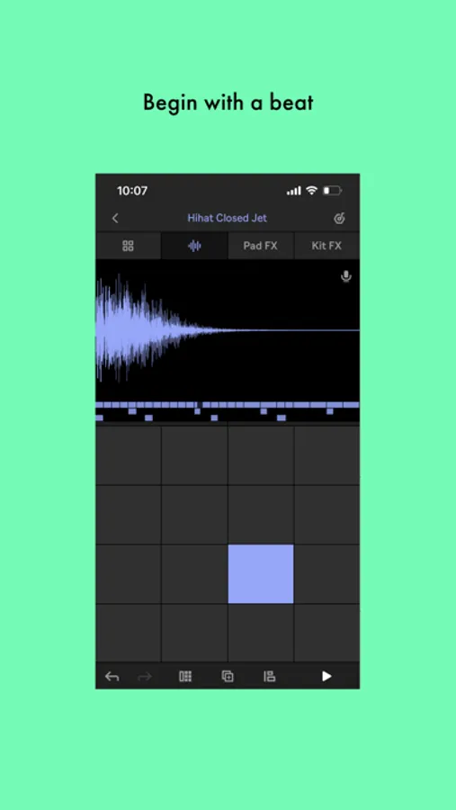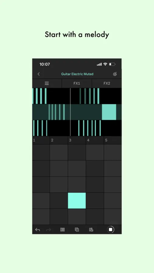 • Play your melody or chord progression with either the 25-pad grid or the piano roll