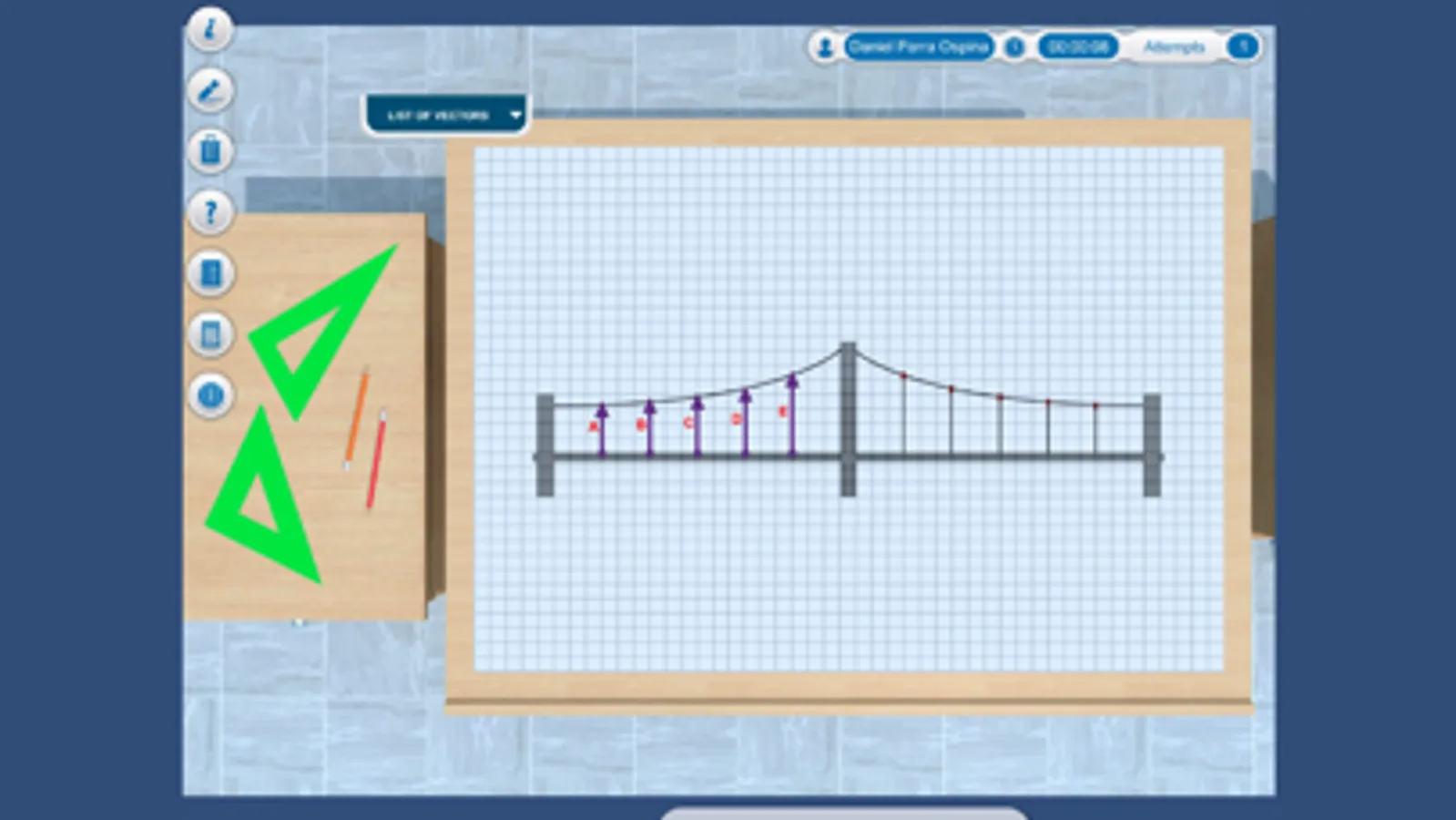 This lab has a Cartesian plane available where the user can draw five vectors, use the head-tail graph method, and find the resulting sum. You can also draw a vector of equal magnitude, but in the opposite direction. The goal of the lab is to find the magnitude of the vectors, the angle, and the components in X and Y.