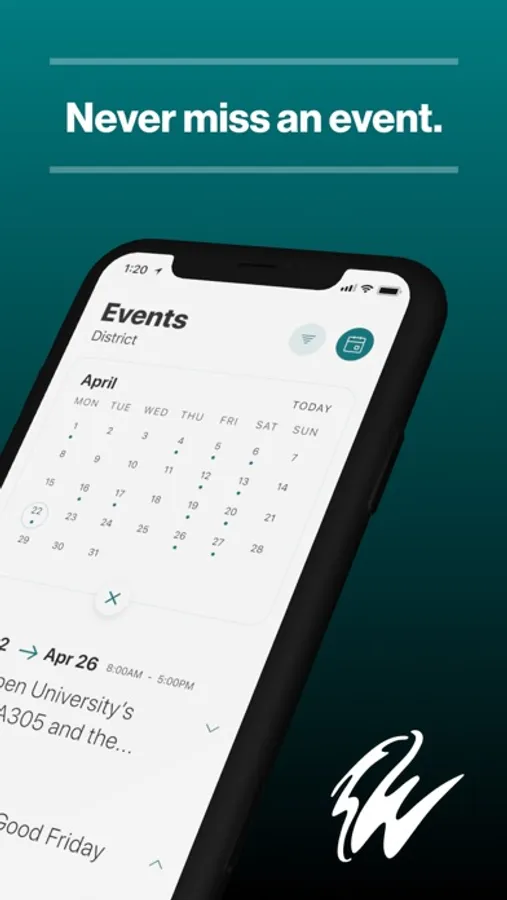 The event section shows a list of events throughout the district. Users can add an event to their calendar to share the event with friends and family with one tap.