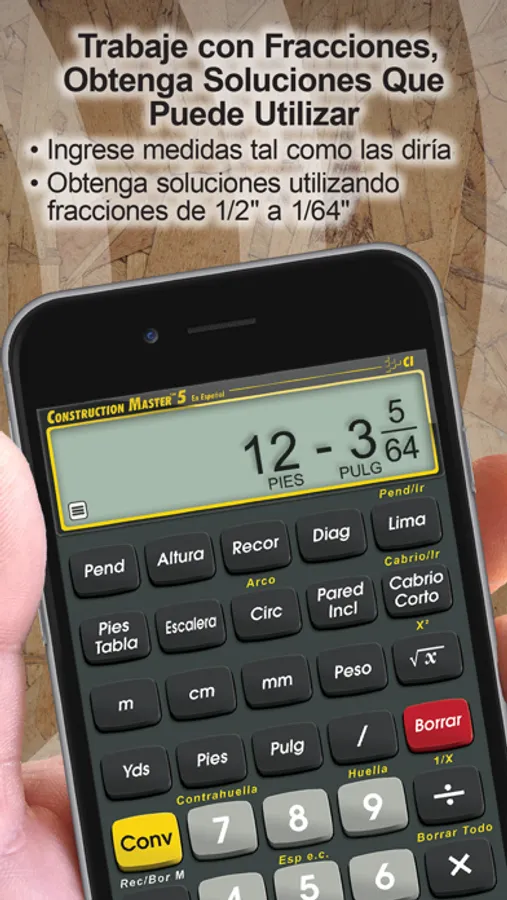 • Trabaje con y convierta entre todos los formatos dimensionales de construcción: pies-pulgadas-fracciones, pulgadas fraccionarias, yardas, pies decimales, pulgadas decimales y unidades métricas (m, cm, mm)