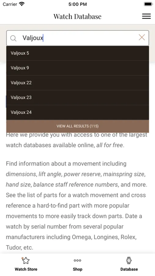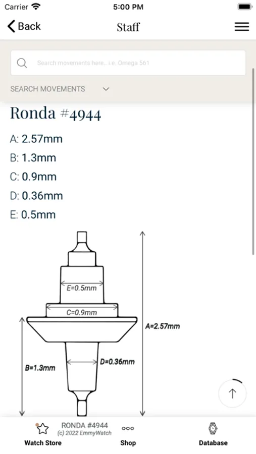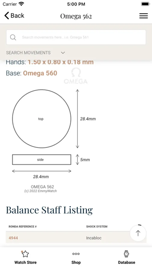 The EmmyWatch mobile app provides you with quick access to the largest watch database available online. We at EmmyWatch maintain and provide access to the database entirely free. Within the database we have information on ~150,000 watch movements and references including lift angles, beat rates, diagrams, dimensions, documents, etc. As well we have information on ~250,000 watch parts, ~5000 mainsprings, ~4000 balance staffs, thousands of hand sizes, etc, all of which are cross referenceable to make part searches much easier.