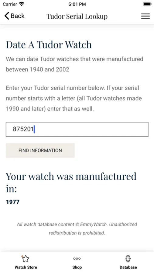Want to date your watch? The EmmyWatch mobile app contains serial lookup tools for most of the popular brands including Omega, Rolex, Tudor, Seiko, Universal Geneve, Tissot, and much more!