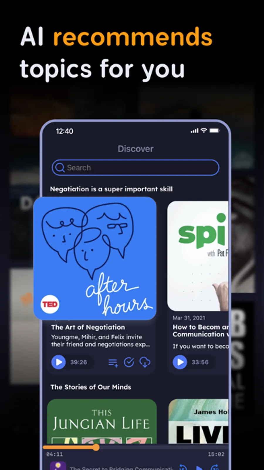Noorami will recommend episodes based on your preferences and the topics that you have listened to. Our AI automatically generates topic sentences for you, so you know why the episodes are being recommended and what topics are discussed within them.