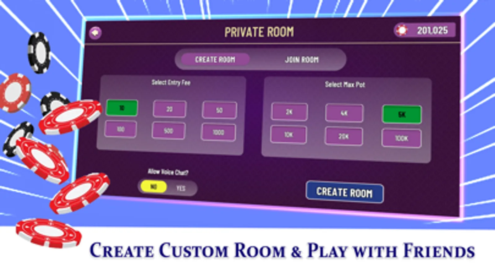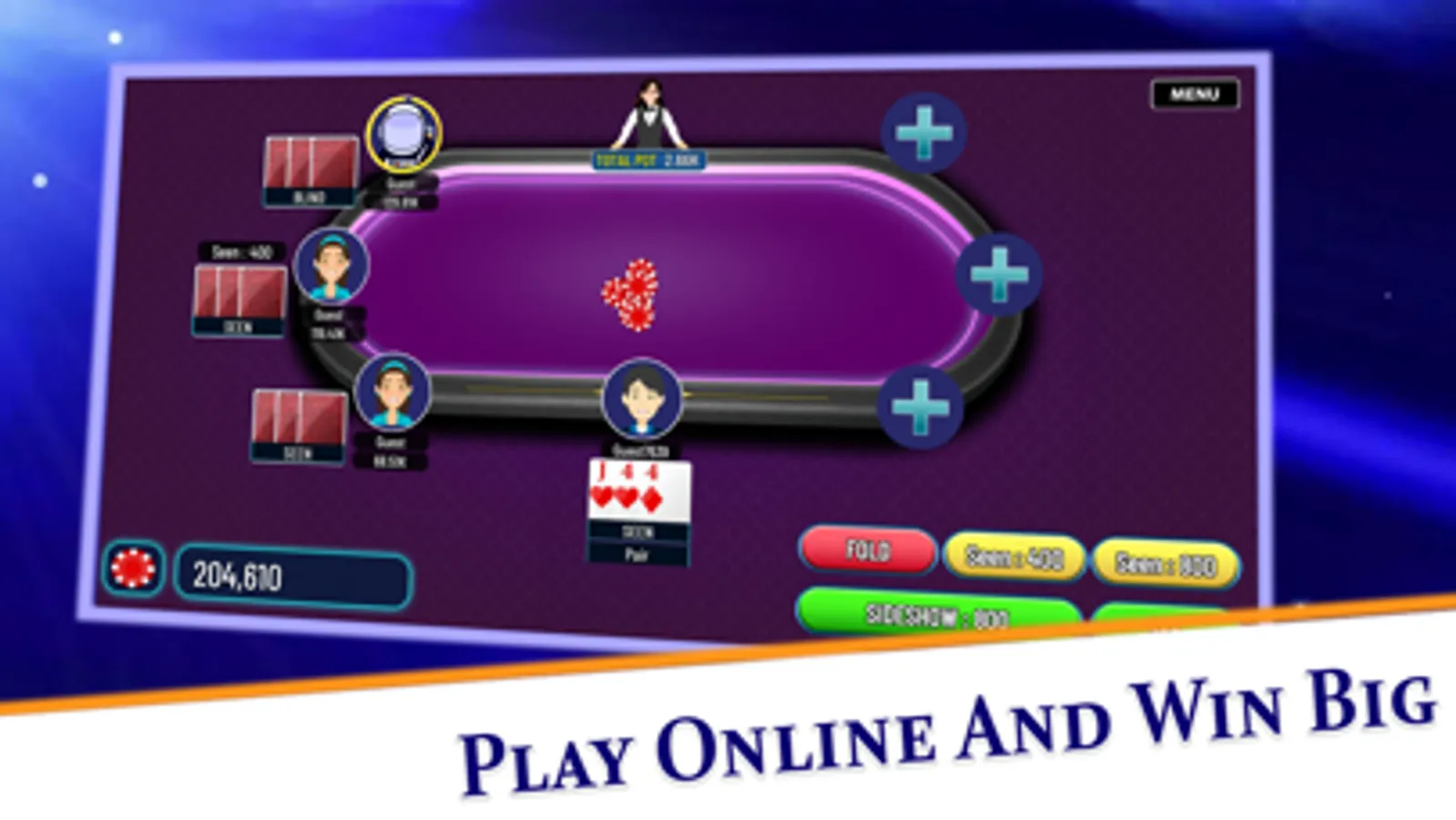 In Teen Patti, you can play online with other players or challenge your friends by inviting them to your private room.