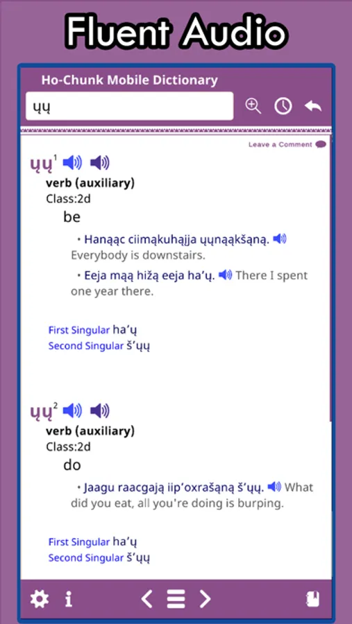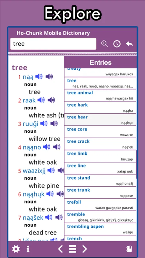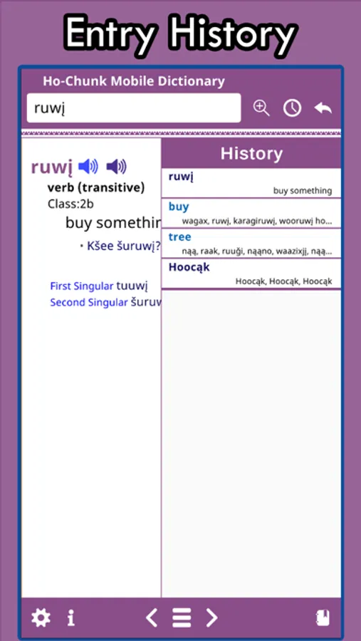 • There are two sides to the Ho-Chunk Mobile Dictionary. If you are currently viewing a Ho-Chunk word, you are on the “Ho-Chunk” side. The left and right buttons will take you to the next or previous Ho-Chunk word in alphabetical order. Tapping the Hamburger button will provide you with a list of the nearest alphabetical words to the entry you are currently looking at