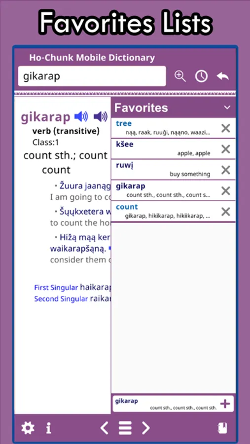 • The Favorites panel allows you to save your favorite words like a bookmark. From this panel, you can create new lists, add words to specific lists for later review, and better organize using the Ho-Chunk Mobile Dictionary as YOUR Ho-Chunk language learning tool