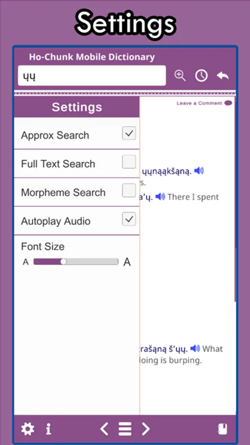 • The Settings menu allows you to refine how the search works, change the font size, and turn “AutoPlay Audio” on or off. See the “Searching the Dictionary” section for more details on the search settings