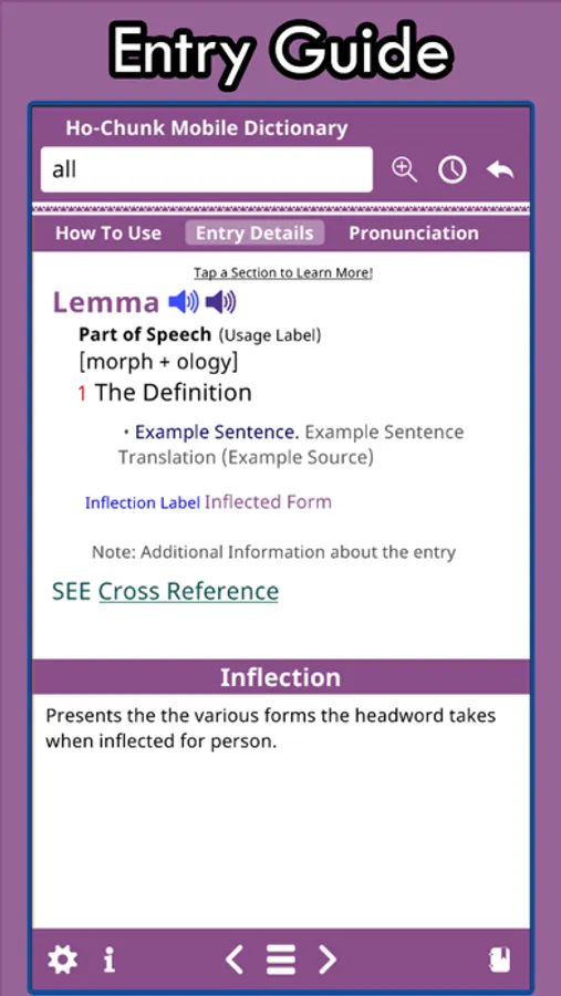 • You are currently reading the information section. Select a tab from the sliding bar above to learn more about "How To Use" the dictionary, "Entry Details", and "Pronunciation."