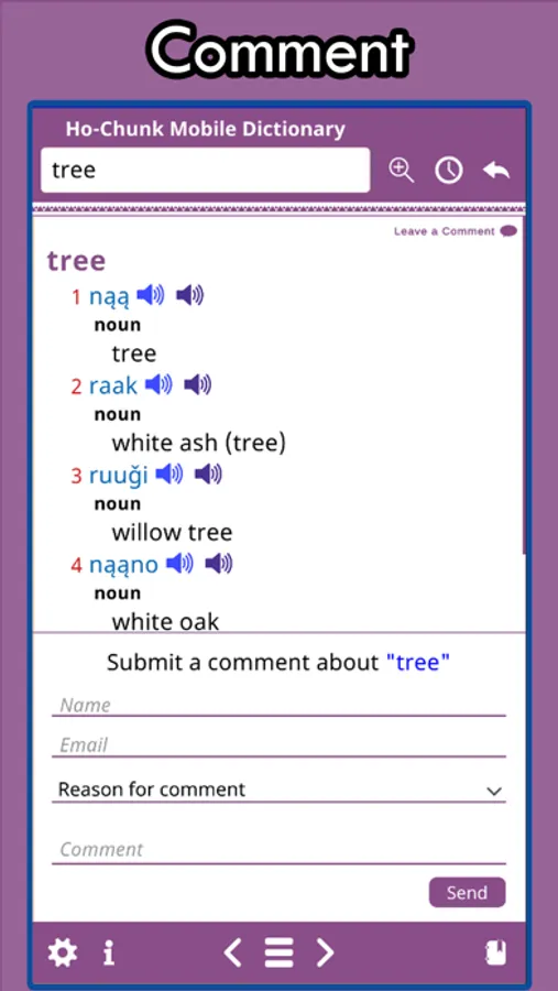 • The comment button at the bottom of every entry allows you to send feedback to us so that we can make improvements to future versions of the dictionary