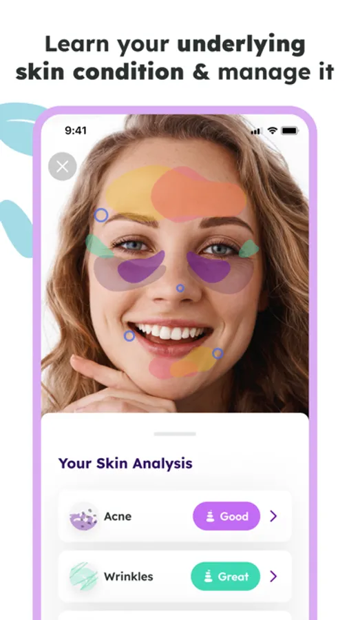 You take one selfie, and the miracle happens. Let our advanced artificial intelligence technology analyze your skin under six critical topics and generate a detailed report.