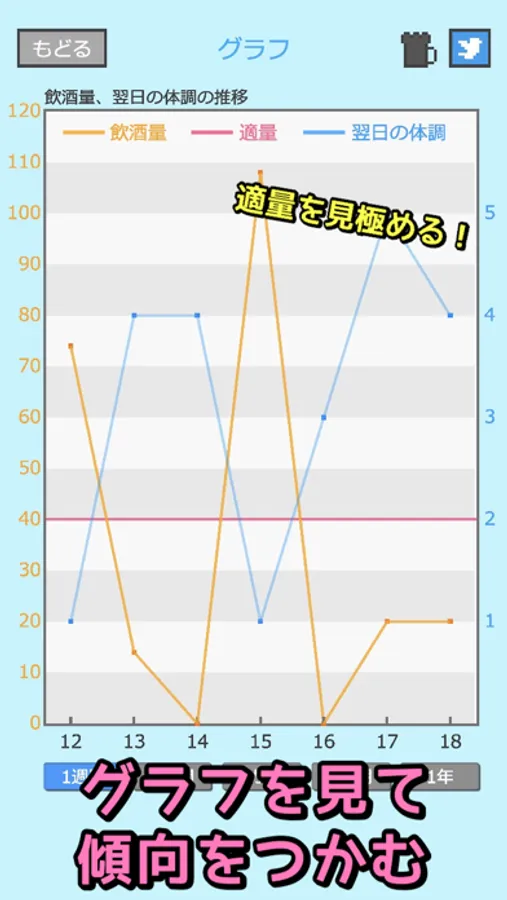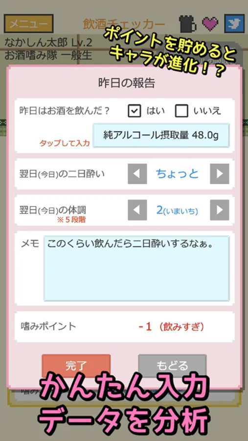 ただ飲酒量を記録するだけでなく、二日酔いのデータからあなたの「適量」を分析します!