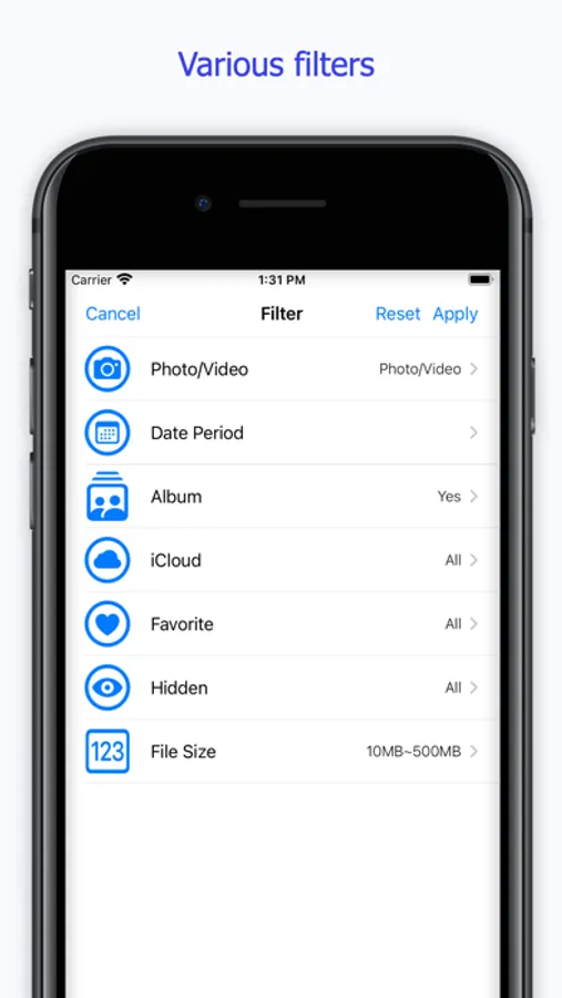 Photo/video, date period, album, media type(live photo, ...), iCloud, favorites, hidden and file size