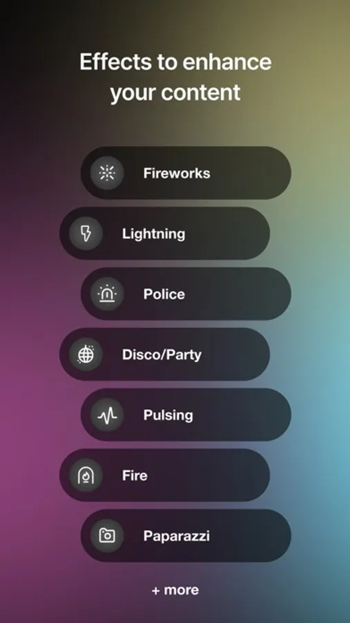 - Experiment with special effects including: police car, disco, fire, strobe, paparazzi, faulty globe, TV, lightning, fireworks and pulsing.