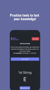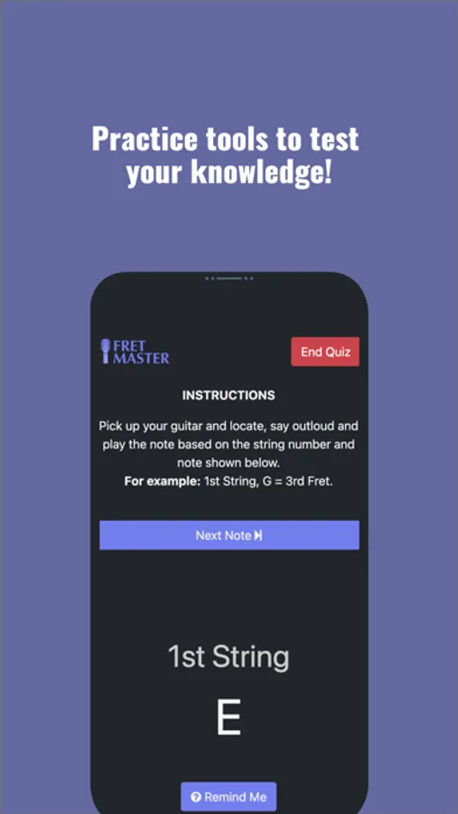 Fret Master challenges you, with your guitar to memorise the notes and if you really can't find the note - the app offers a gentle reminder. You'll find as you use the app that your memory of the location of the notes will really improve and your knowledge of the fretboard.