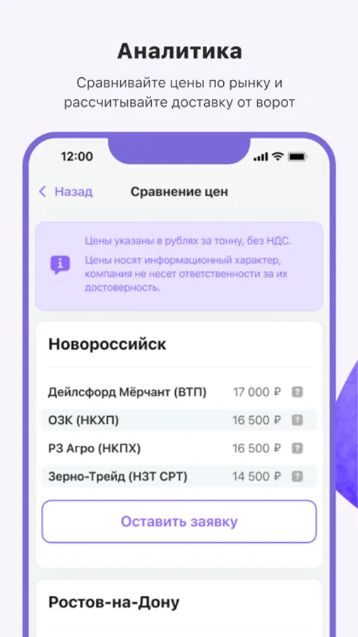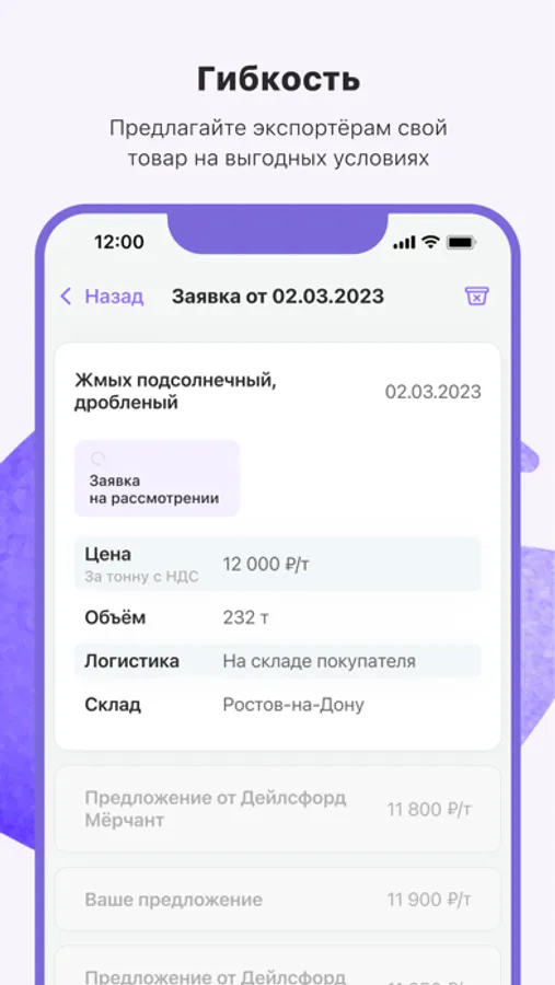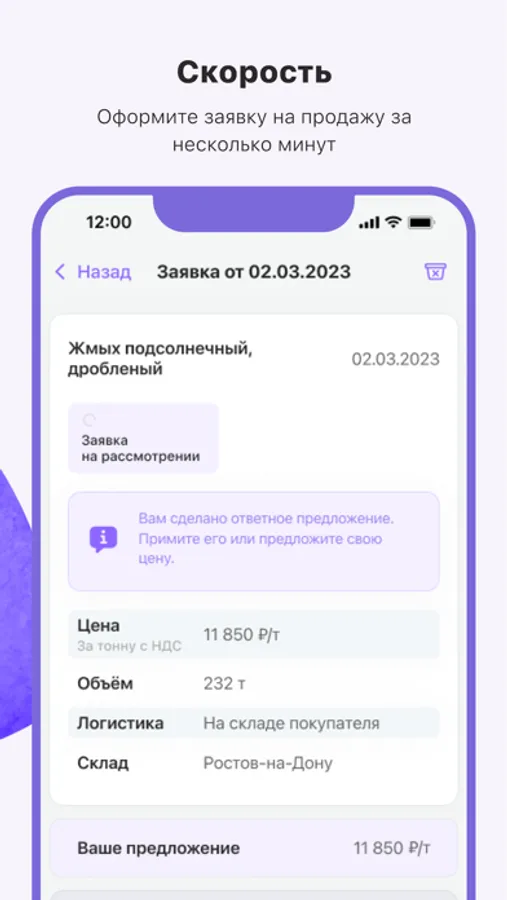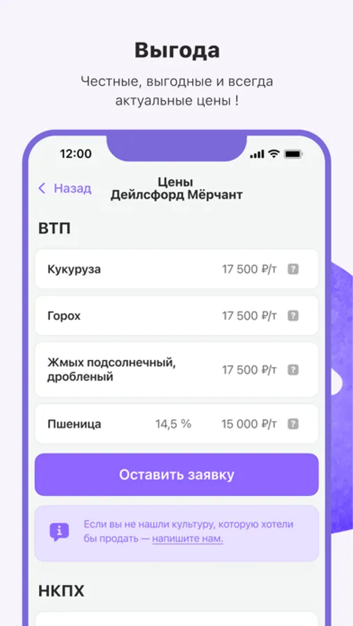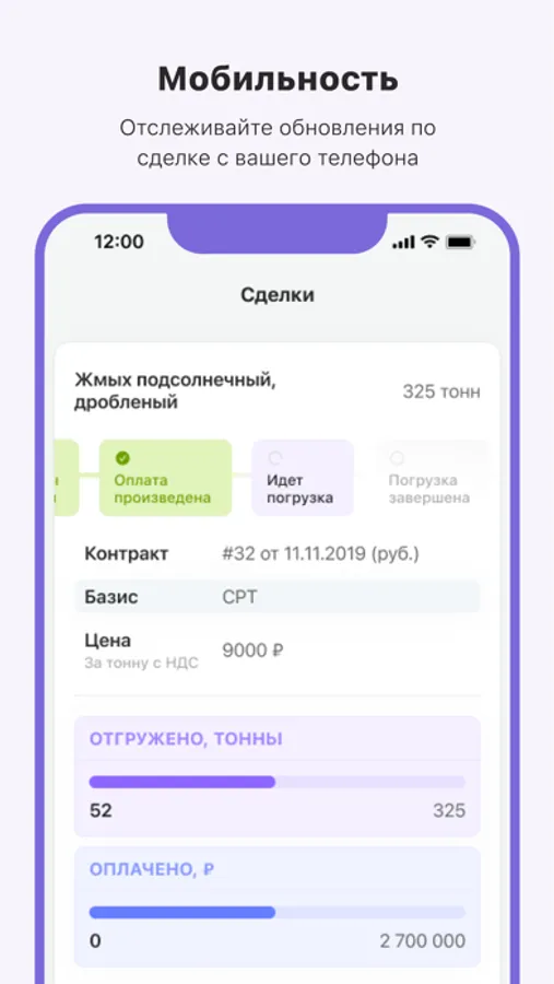 Мобильное приложение для агробизнеса, которое позволяет участникам рынка в условиях доверия и прозрачности покупать и продавать сельскохозяйственную продукцию. Платформа охватывает весь бизнес процесс: от заключения контракта до подписания актов сверки.