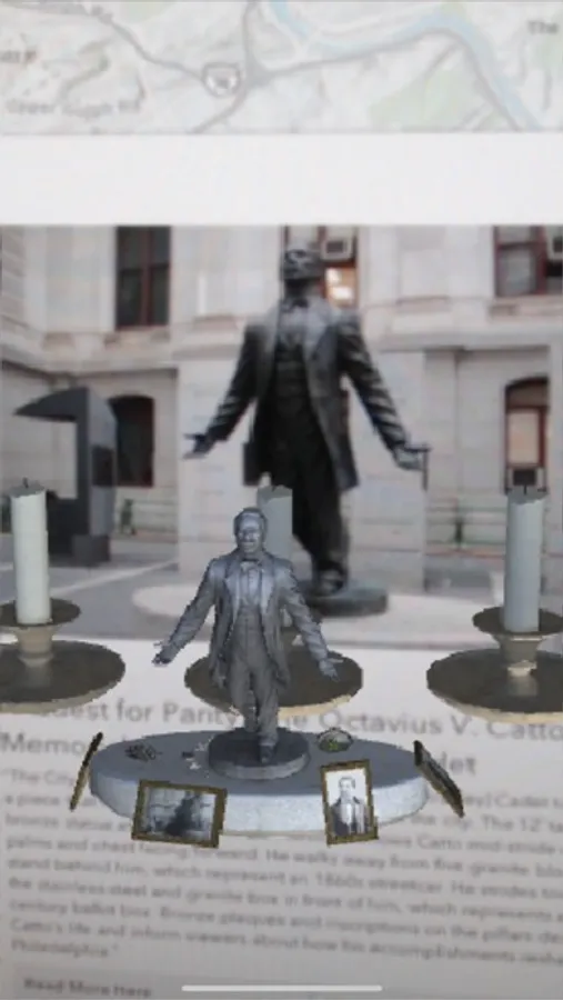 sacredGS AR App is the augmented reality app to activate the interactive features of the map on bit.ly/sacredGS. Since its inception, this project has expanded into a virtual collage of local public artworks, African sculptures and instruments from the Philadelphia Museum of Art and Temple University Libraries’ Charles L. Blockson Afro-American Collection, and spiritual and metaphysical items in order to transform each included outdoor sculpture and mural into altars adorned with the latter elements. “Sacred Geographic Superimpositions” is a spiritual scholarly endeavor to document and celebrate ephemeral Black public art in Philadelphia in a manner that transports them into the ancestral plane of the “transformative archive” to bring scholarly research and data curation out of the academy into a curated space grounded in storytelling and interpretation.