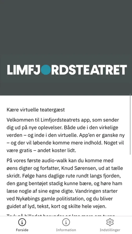 Velkommen til vores app, hvor du kan opleve nye sider af scenekunsten og gå på opdagelse i en verden, der bevæger sig i og omkring teatret. Det kan være poetiske vandringer, gyserhistorier, fortællinger fra bagscenen eller teatrets historie.