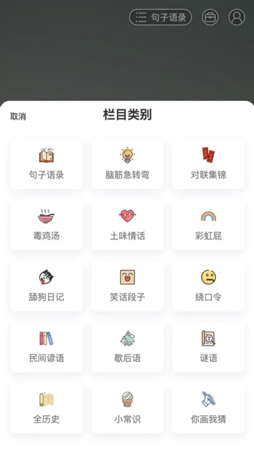 「简语」是一款极简设计与专注阅读的短语句子类应用,无繁琐的交互,重点突出内容本身。支持多种主题、收藏、摘抄等功能,同时还包含了“句子语录、脑筋急转弯、对联集锦、毒鸡汤、土味情话、彩虹屁、舔狗日记、笑话段子、绕口令、民间谚语、歇后语、谜语、全历史、小常识、你画我猜”等众多栏目。
