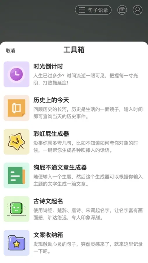 除此之外,在2.0版本开始新增了工具箱功能,目前集成了“时光倒计时、历史上的今天、彩虹屁生成器、狗屁不通文章生成器、古诗文起名、成语接龙查询、真心话大冒险、句子文案收纳箱“等工具。