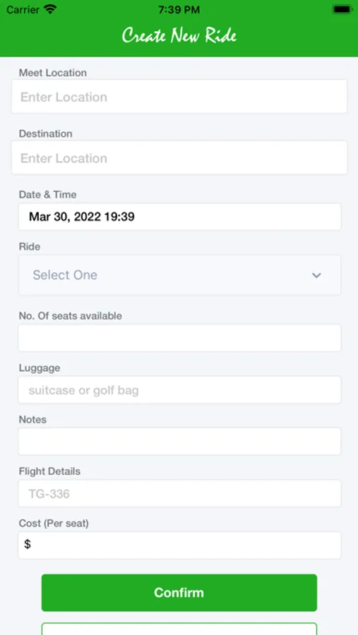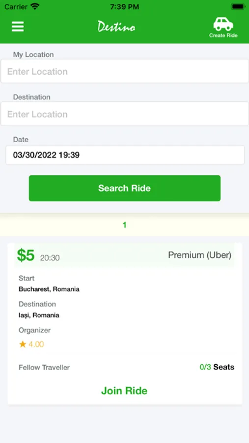 Easy to use, Destino offers users the means to create a discoverable ride including all necessary details like the number of seats, price per seat, car model, etc.