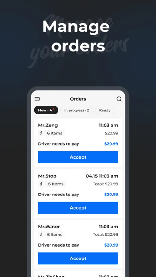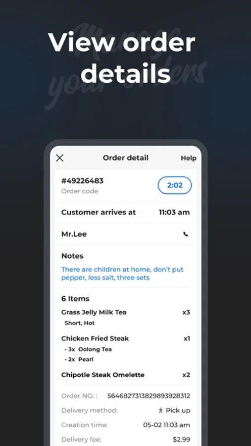 Be notified timely of new orders and be the first to take orders or cancel them accordingly. Arrange orders according to scheduled mealtimes. Check the arrival time of the deliverers. You can call the deliverers or customers when there is a problem with an order.