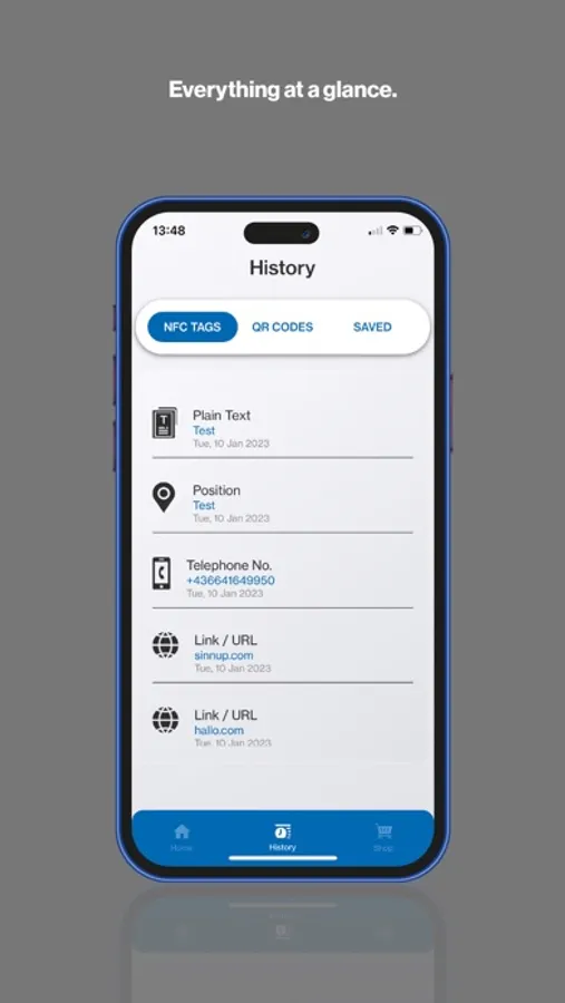 NFC chip and QR code functions can be started or viewed in detail with the app. Furthermore, the app provides you with the history of already created QR codes and NFC chips.