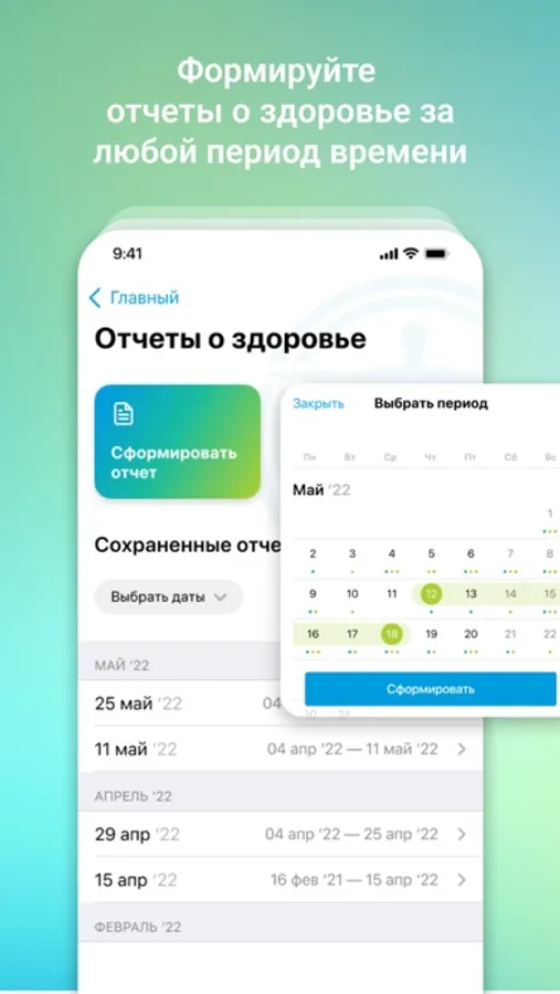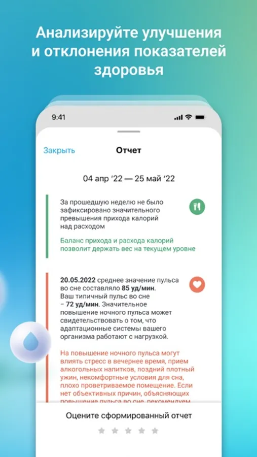 Формируйте отчет с аналитикой ваших показателей здоровья за любой период времени от 1 дня до недель и месяцев. Наблюдайте за улучшениями, следуйте рекомендациям и уменьшайте риски развития заболеваний.