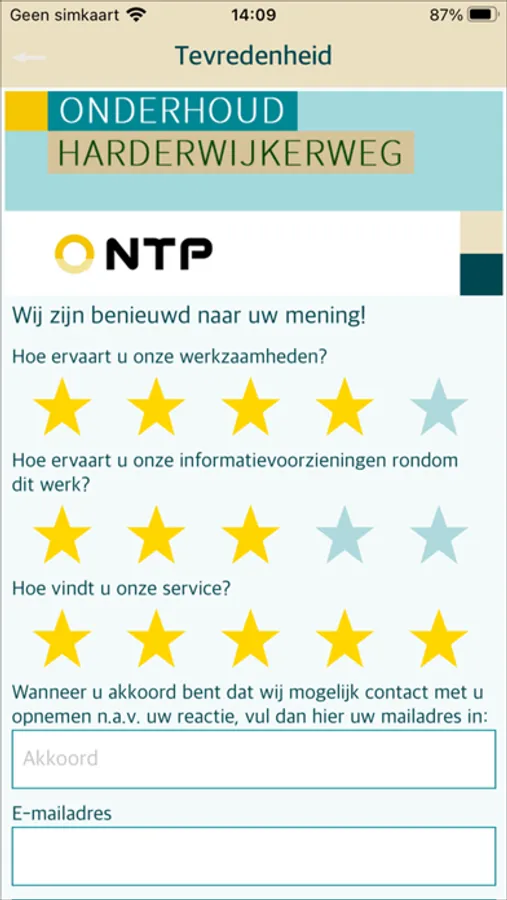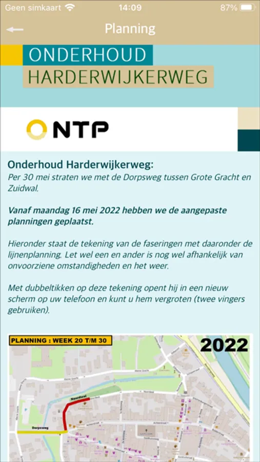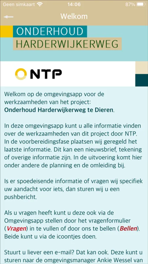 In deze app vindt u alle informatie over de werkzaamheden van het project Onderhoud Harderwijkerweg in Dieren. Er wordt belangrijke projectinformatie, de laatste planning en contactinformatie weergegeven. Ook kunt u op deze app vragen, opmerkingen of klachten achterlaten die betrekking hebben op het project.