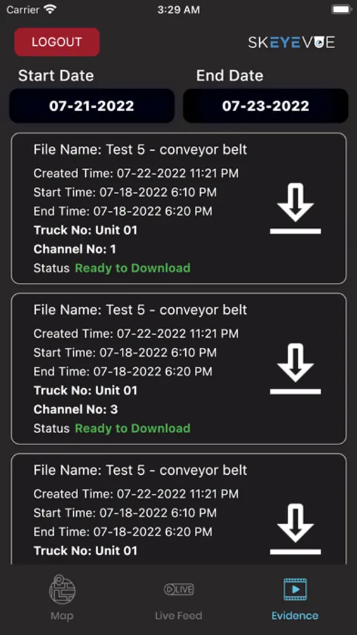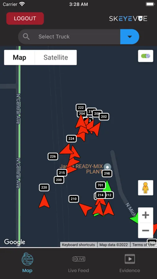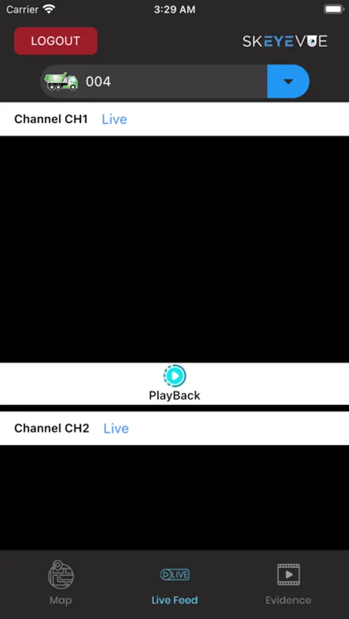 skEYEvue Mobile is a full featured App featuring live video of all installed vehicle cameras using the skEYEvue system. In addition, evidence video requests and playback are available within the app along full GPS tracking map.