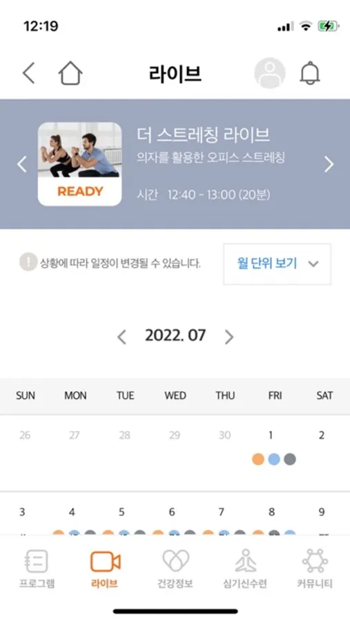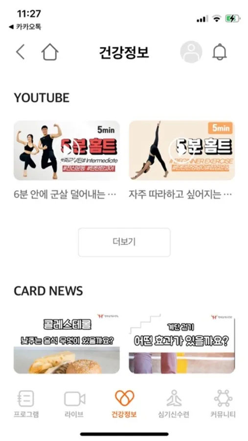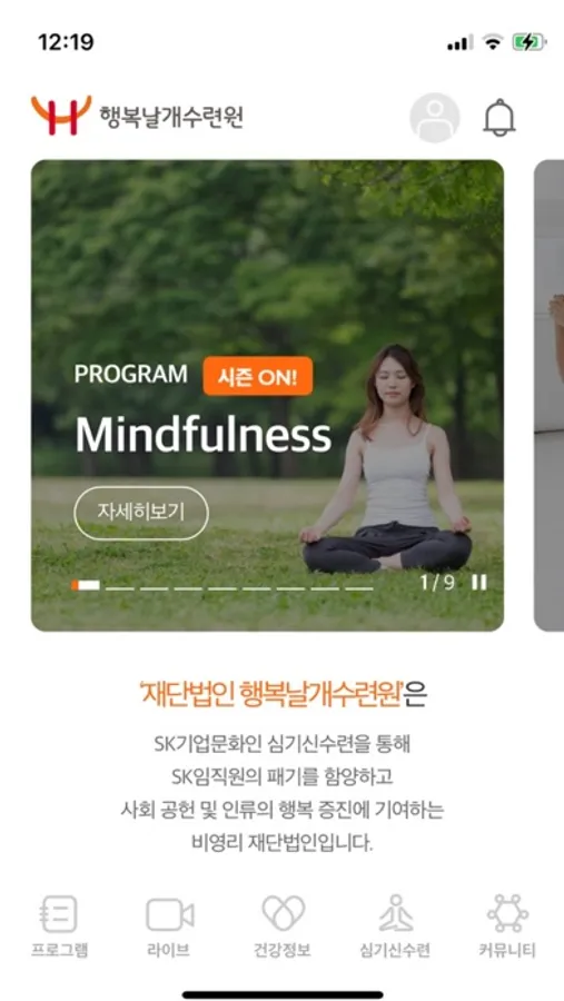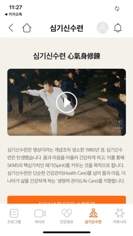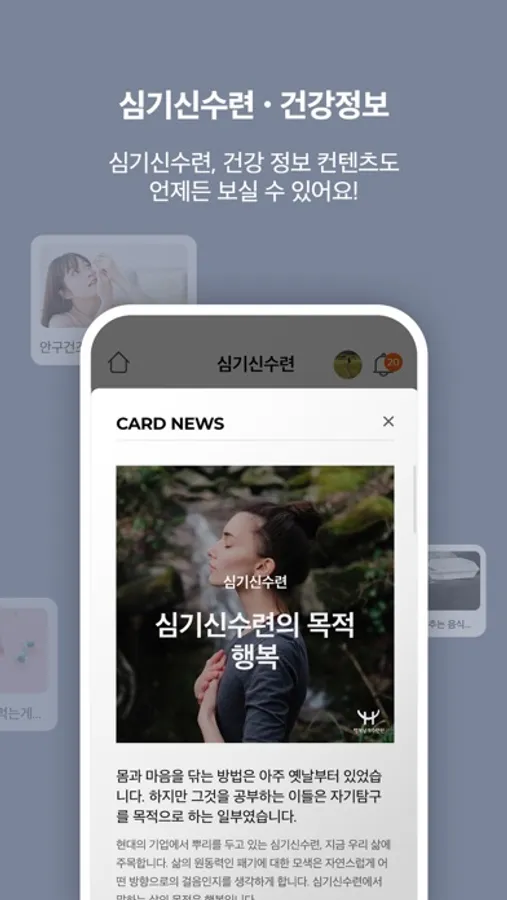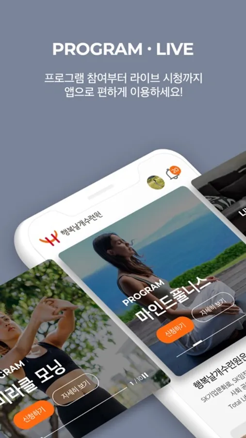 건강 프로그램 참여부터 라이브 시청까지 편하게 사용하기 위한 앱으로 심기신 수련, 건강 정보 콘텐츠도 언제든 쉽게 보실 수 있습니다.