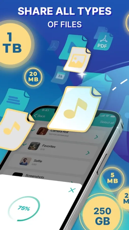 Transfer & Copy My Data Files is the fastest and easiest way to share any files: photos, videos, music, documents, etc. with your friends or transfer them from your old phone to a new one without using Wi-fi or mobile data.